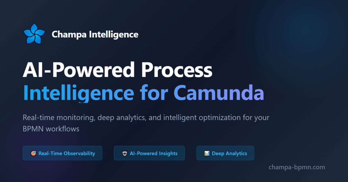 Champa Intelligence is an enterprise-grade Process Intelligence and Observability Platform meticulously engineered to supercharge the Camunda 7 BPMN engine. It transforms raw process execution data into actionable, strategic business intelligence through advanced analytics, AI-powered insights, and comprehensive monitoring.