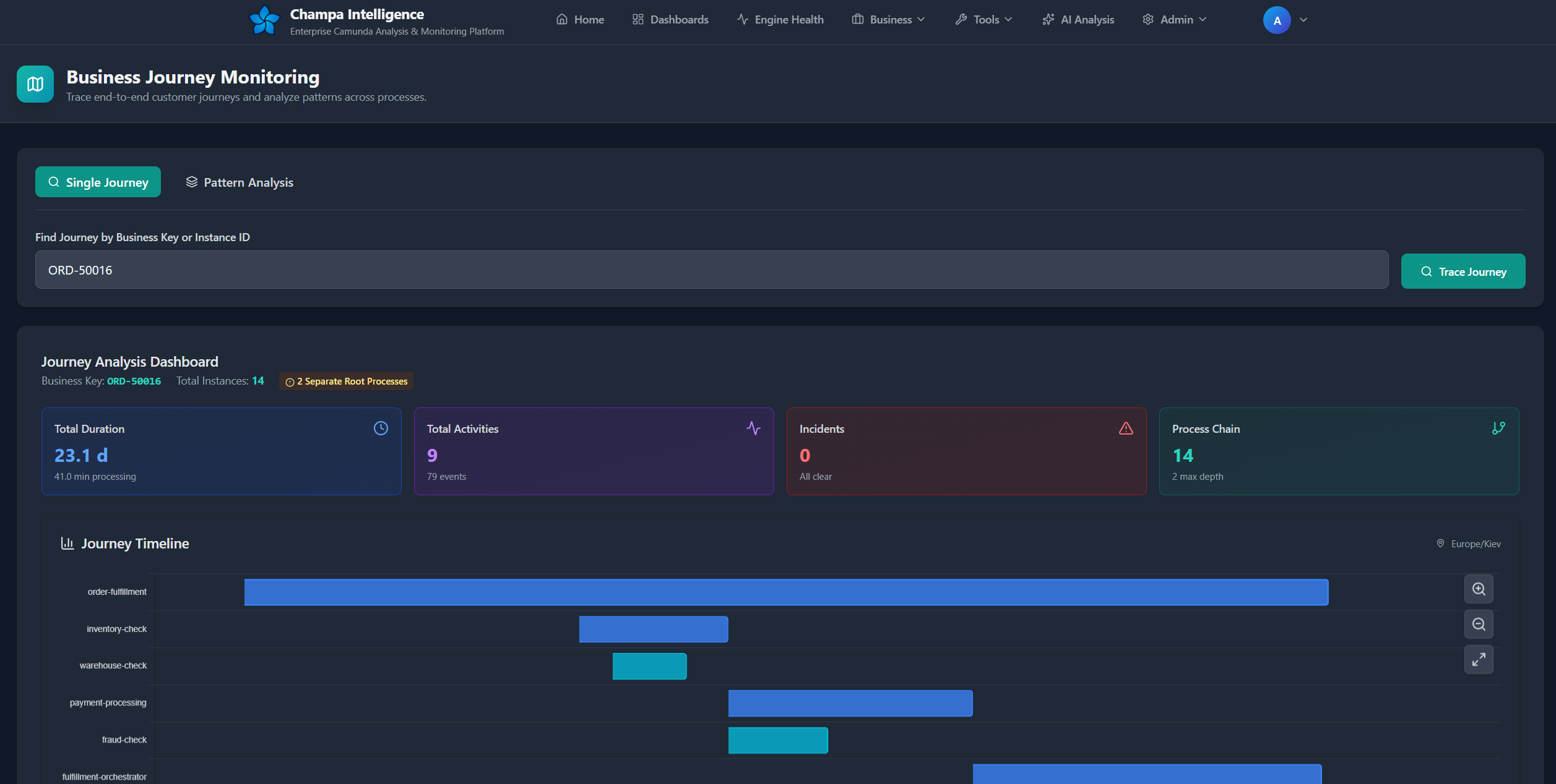Trace any individual customer journey using a business key (order ID, customer ID, transaction ID) or a specific process instance ID.
