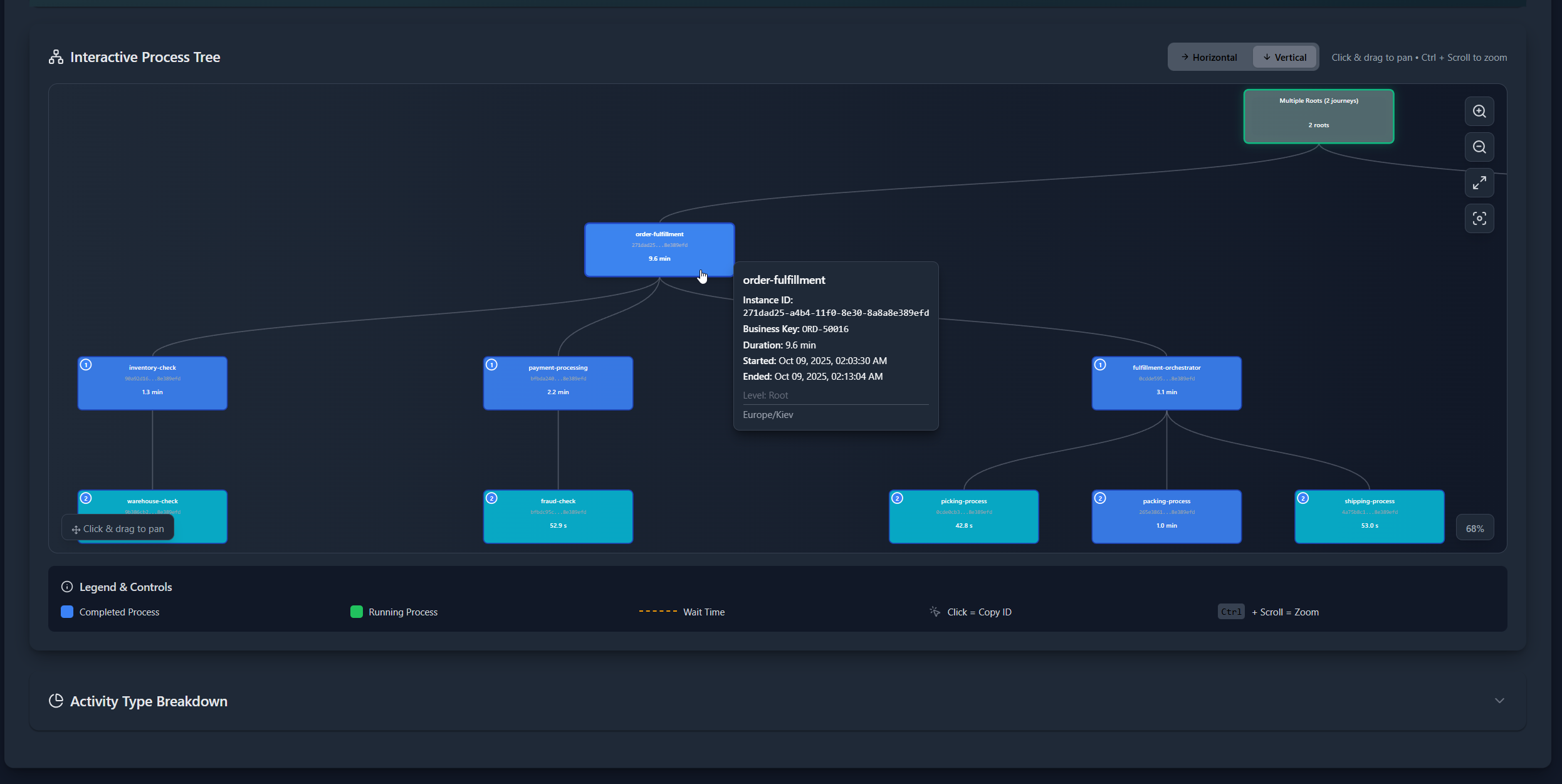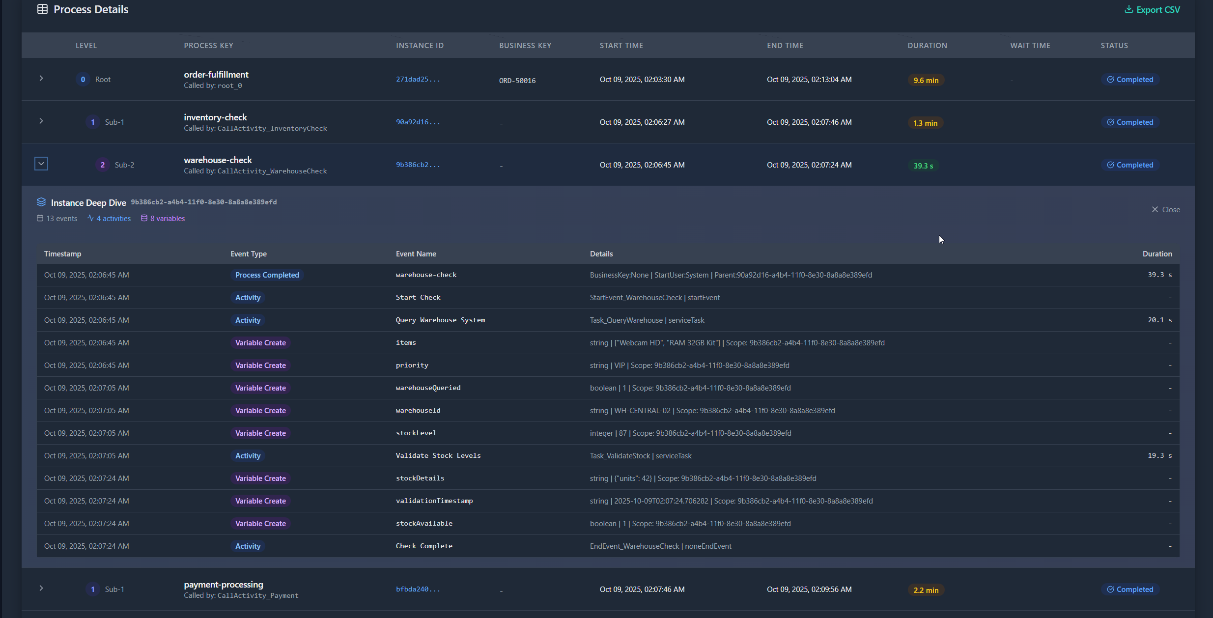 - Complete Hierarchy View - See all related process instances organized as a tree, showing parent-child relationships through call activities and message correlations