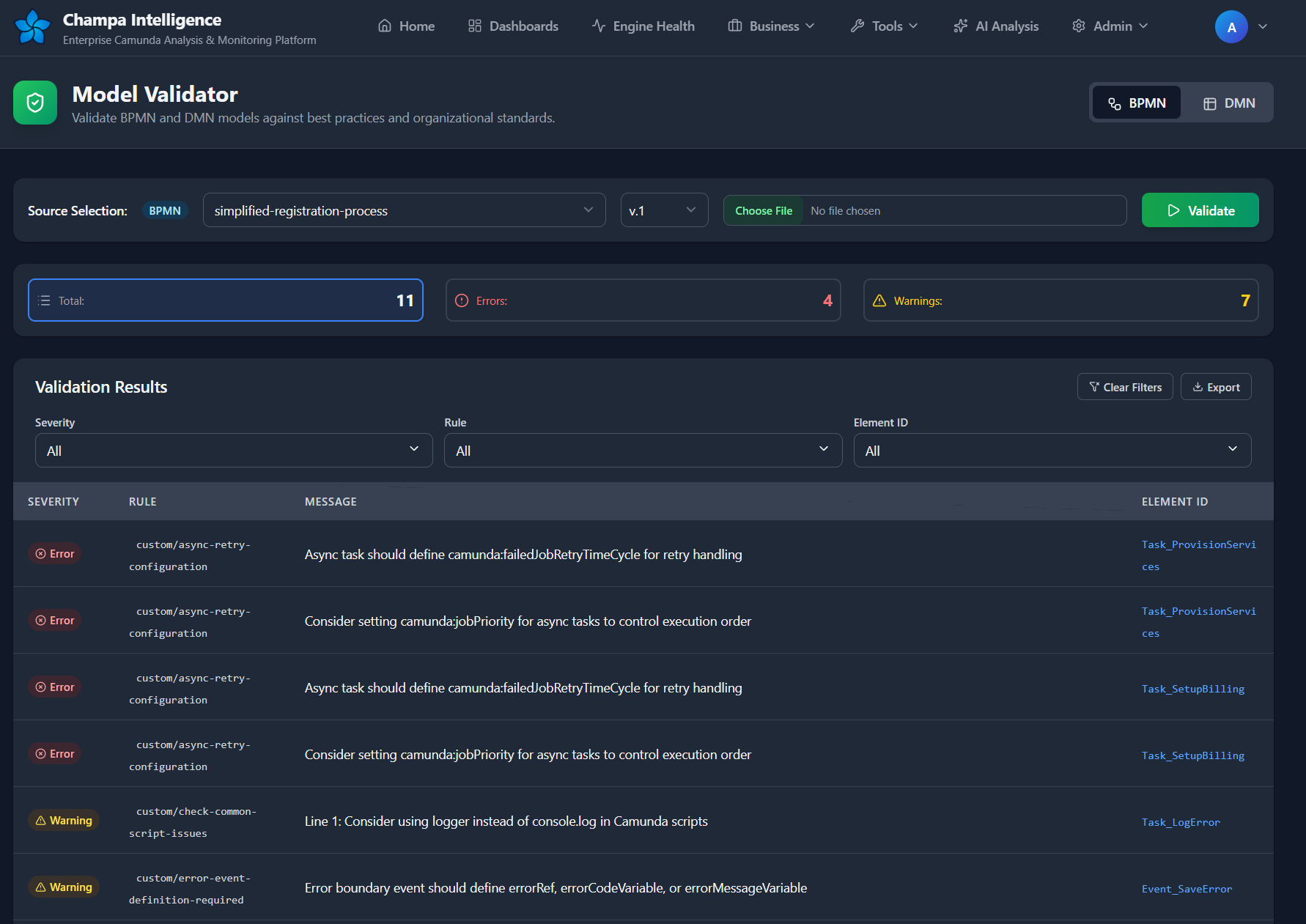 A: Not directly. You must export and upload to Champa Intelligence. However, Camunda Modeler has its own basic linting that catches some issues.