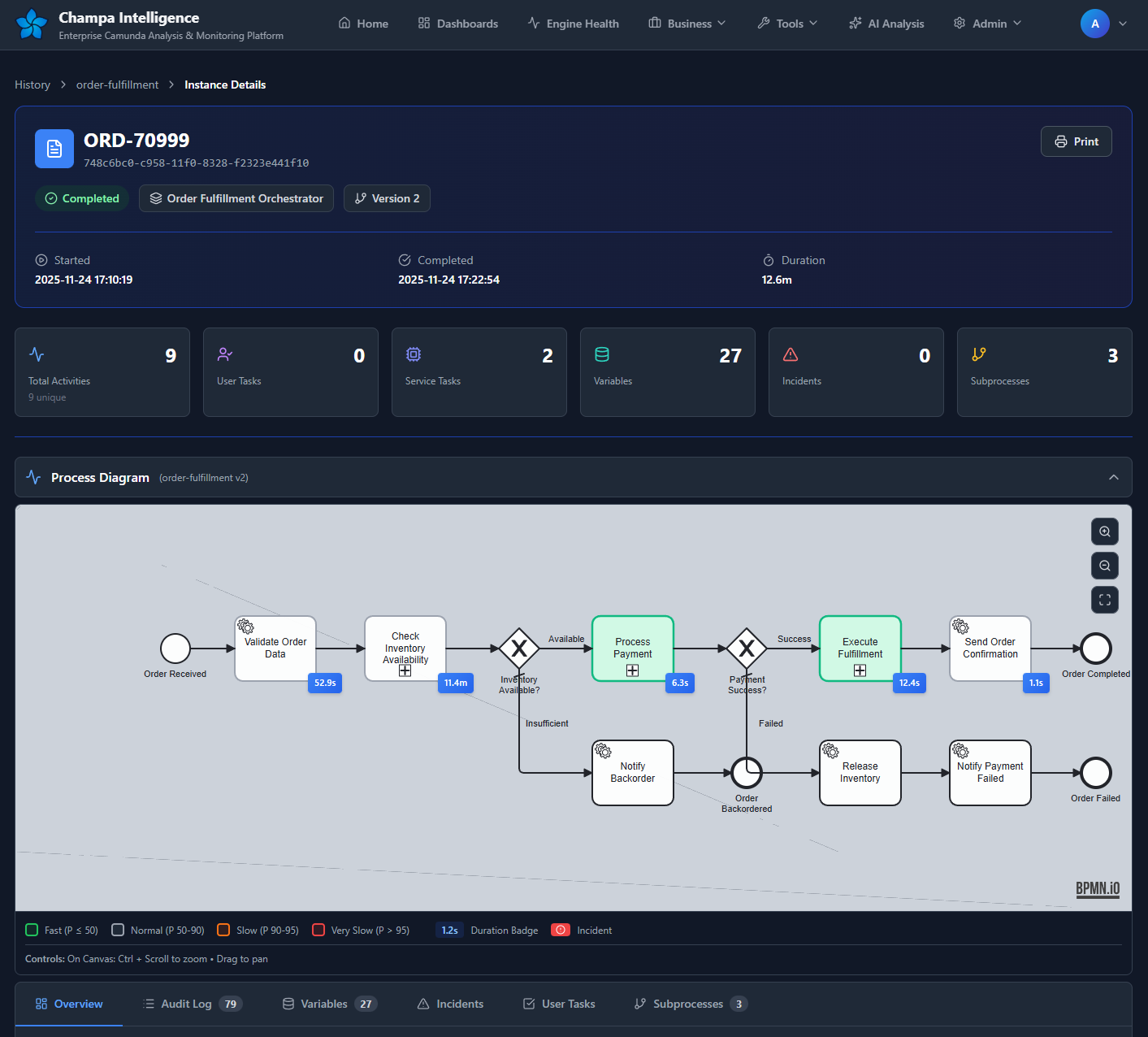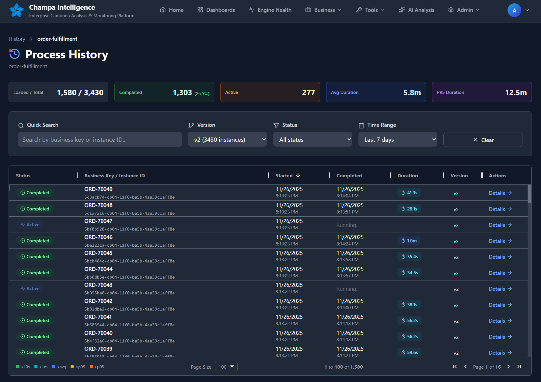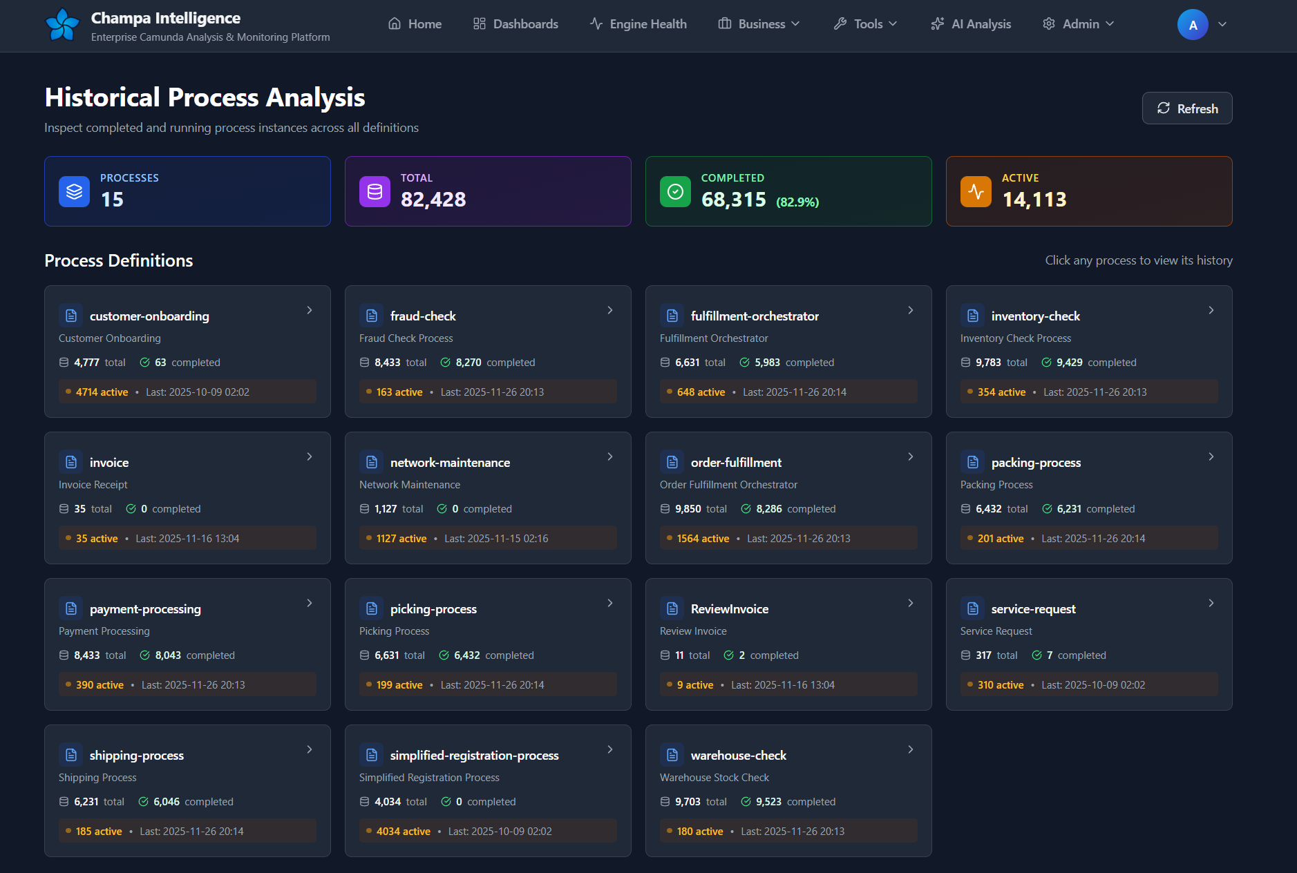 - Process Definition Grid: All deployed processes with their individual health stats.