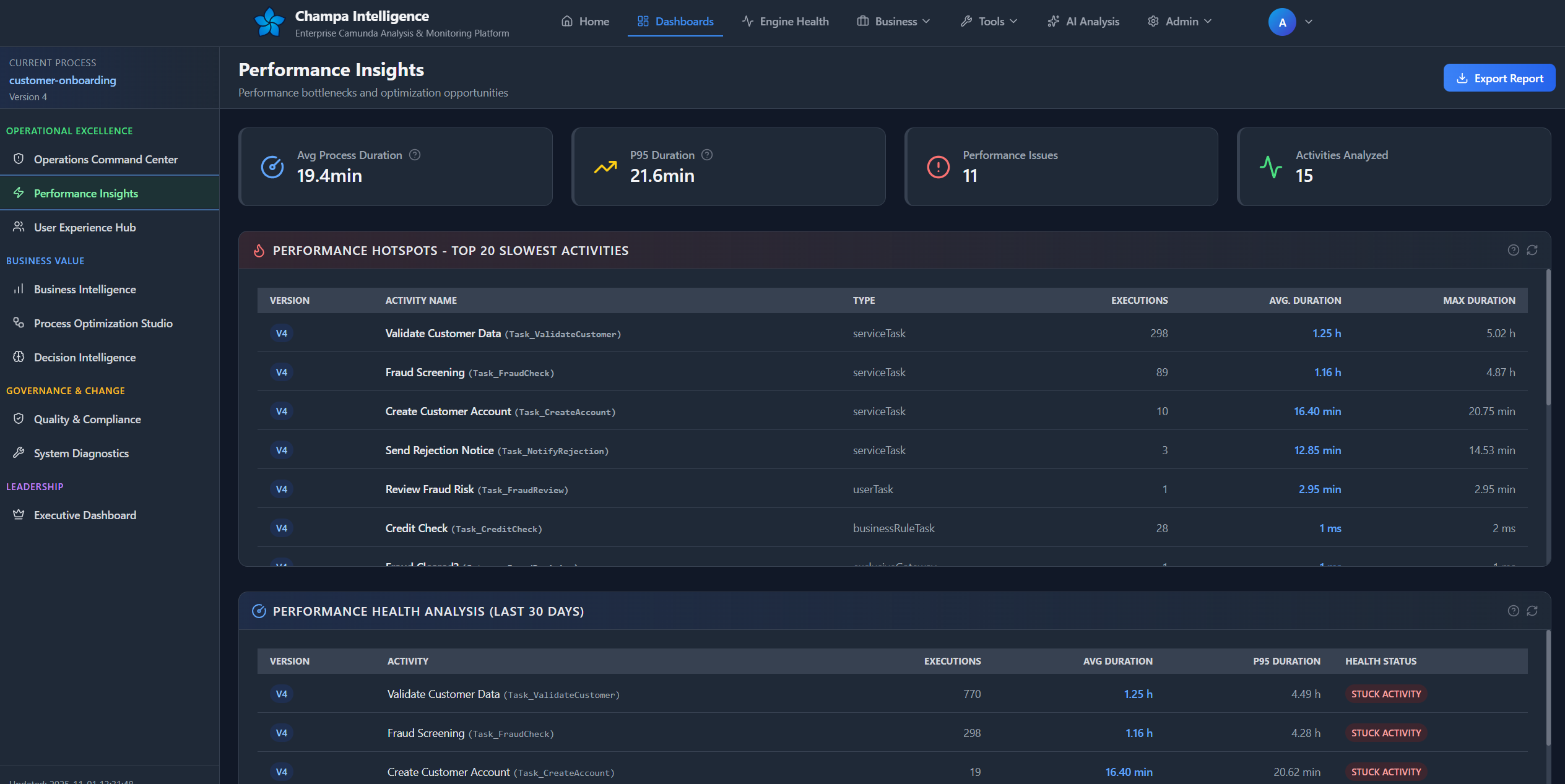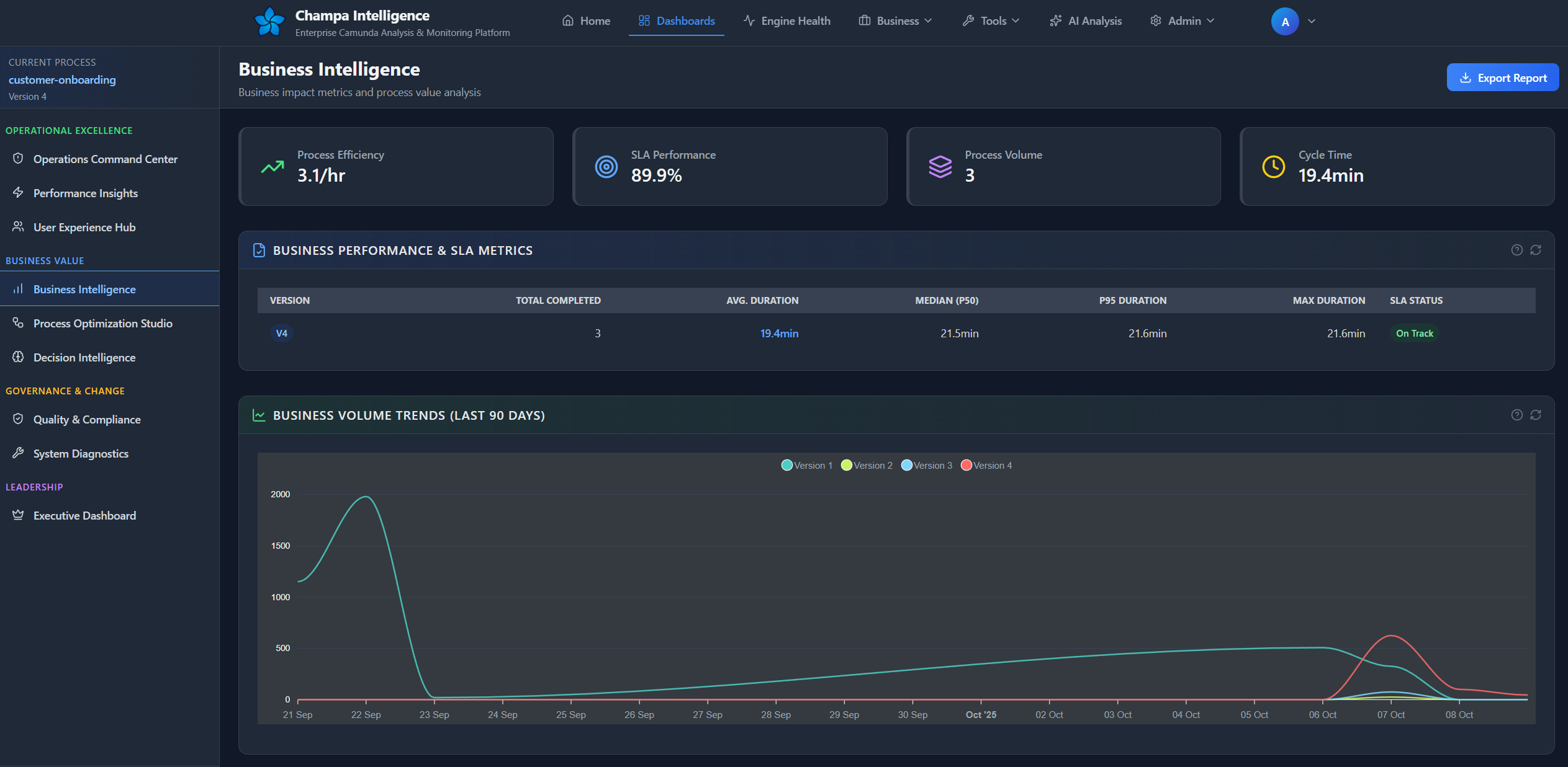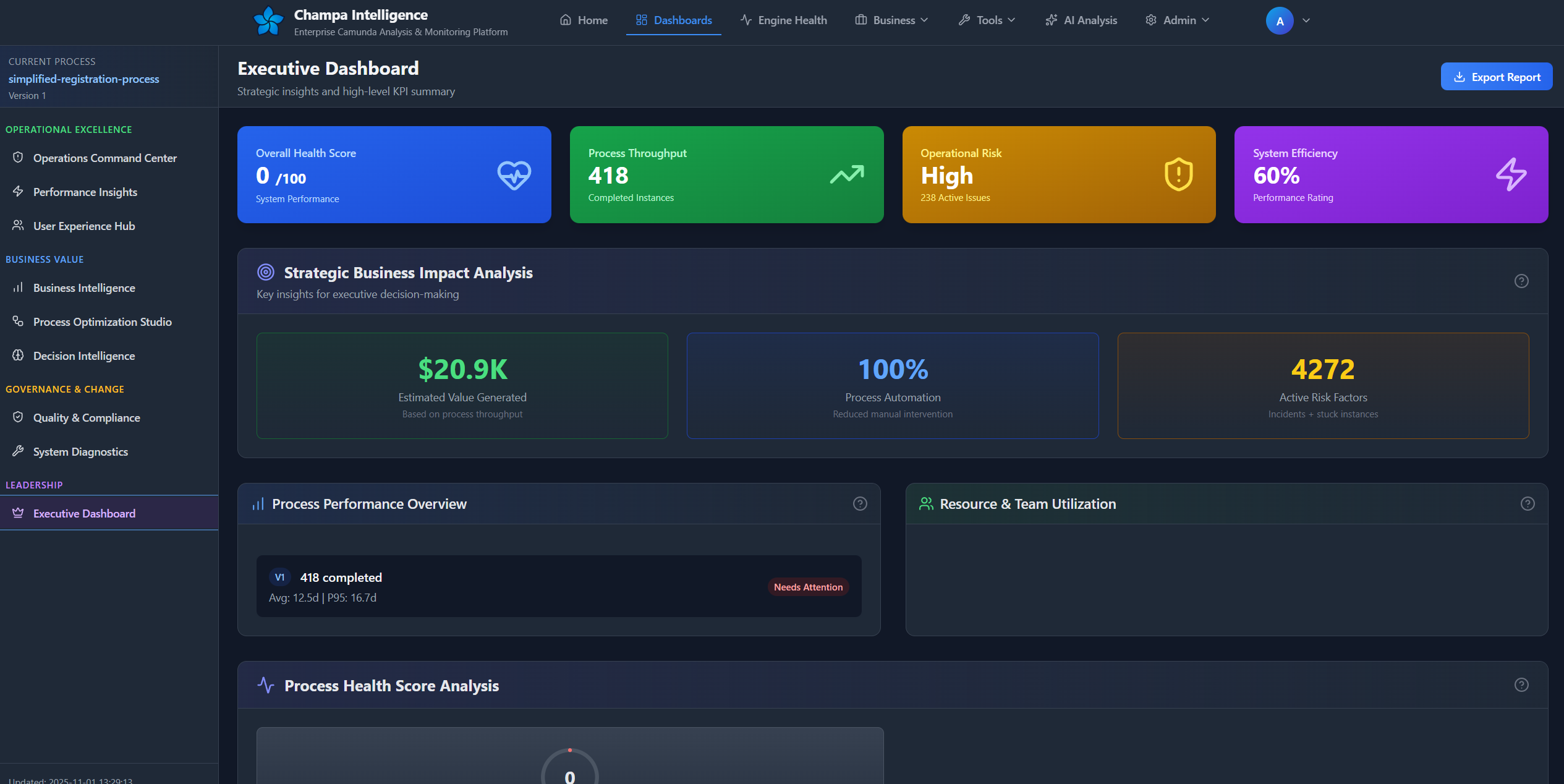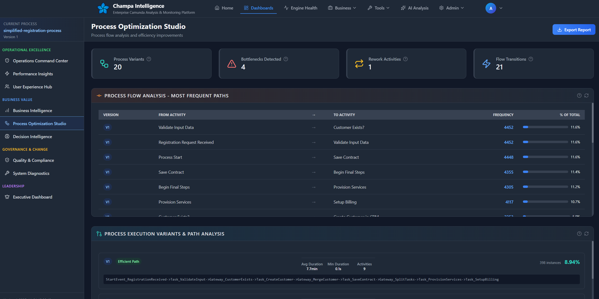 The Process Intelligence Dashboard is your mission control for Camunda process analysis, delivering deep insights into performance, quality, and operational health across your BPMN processes.