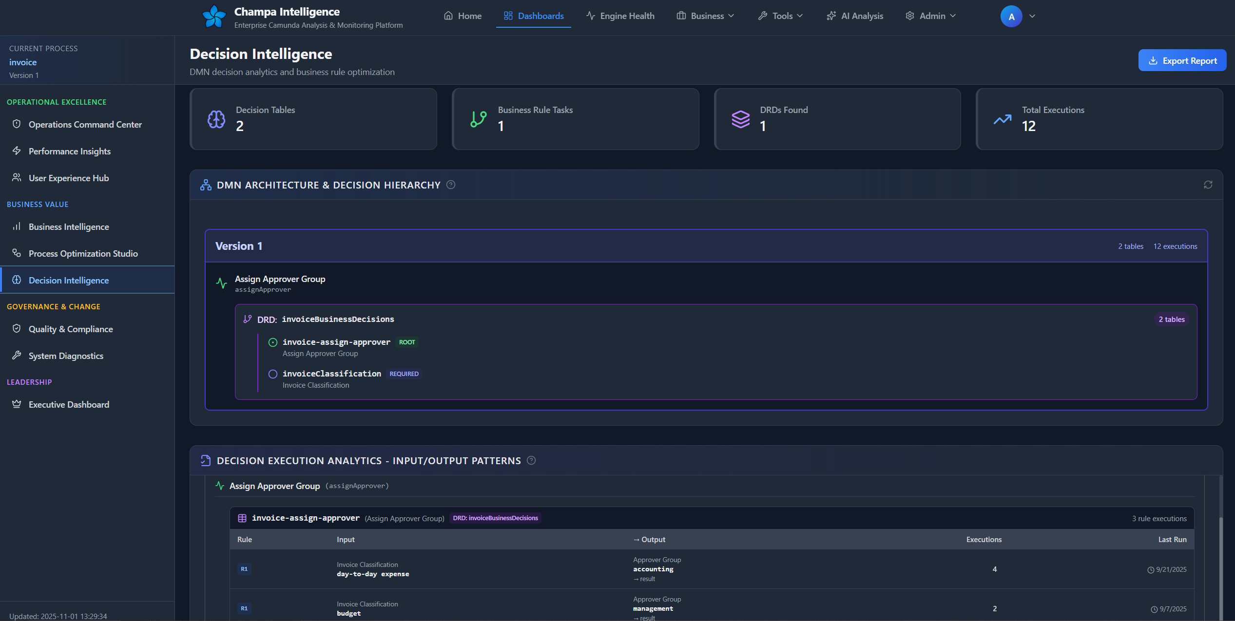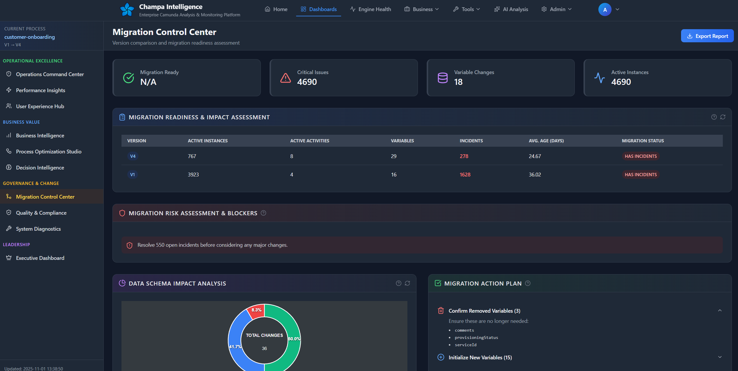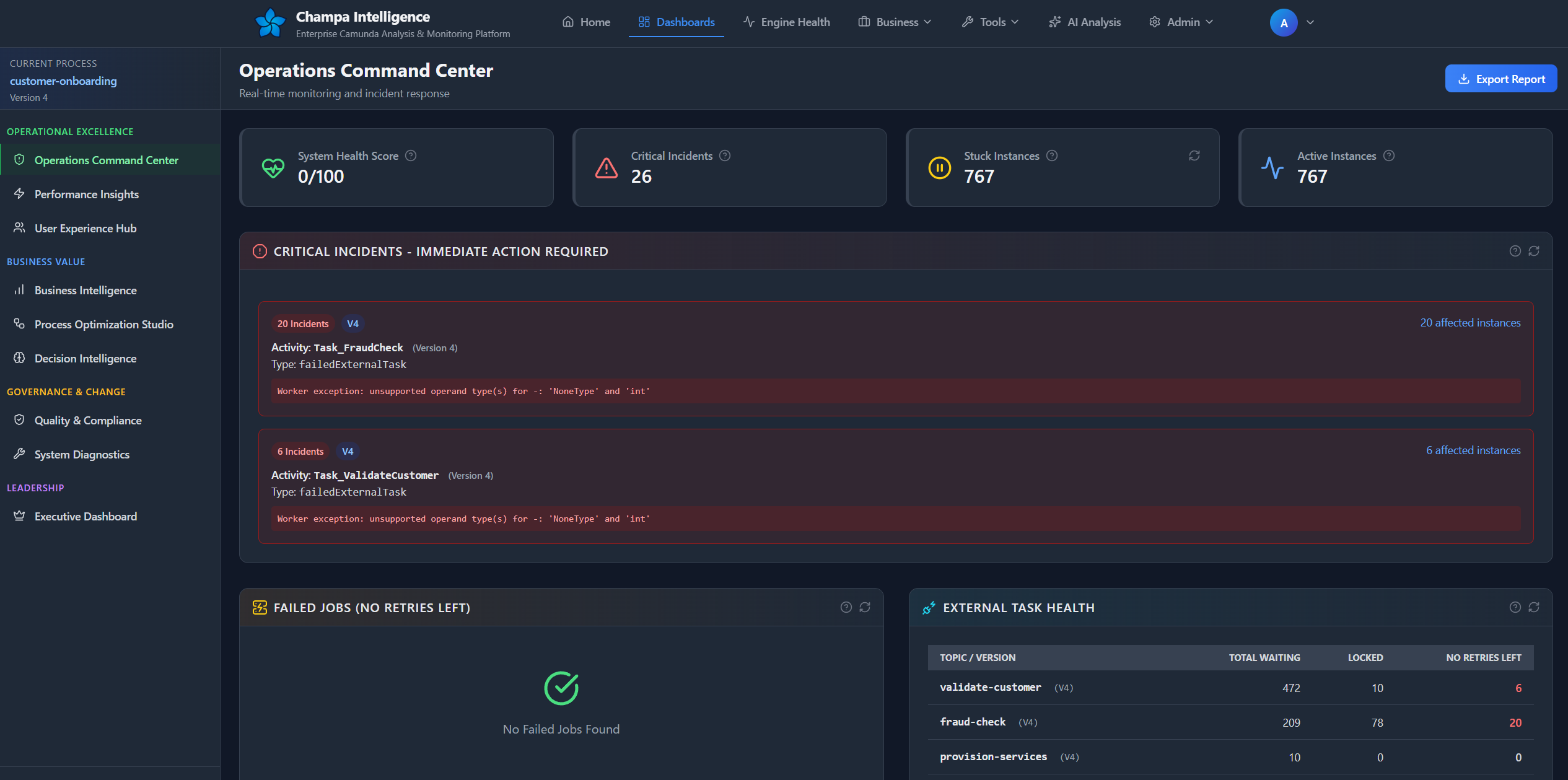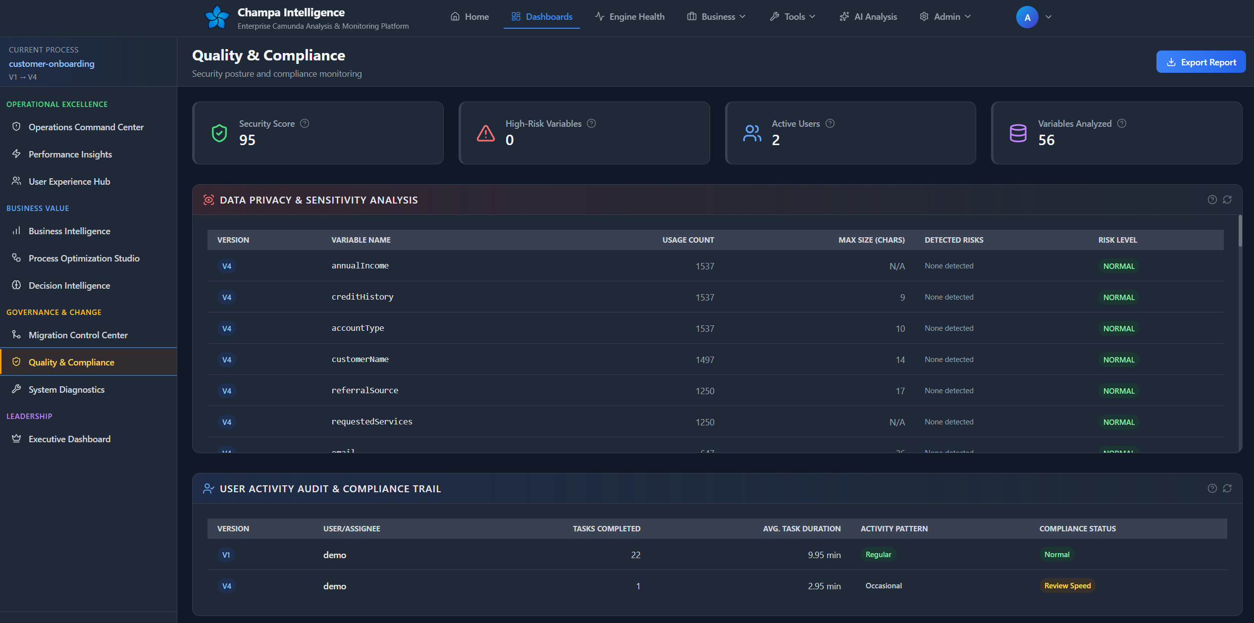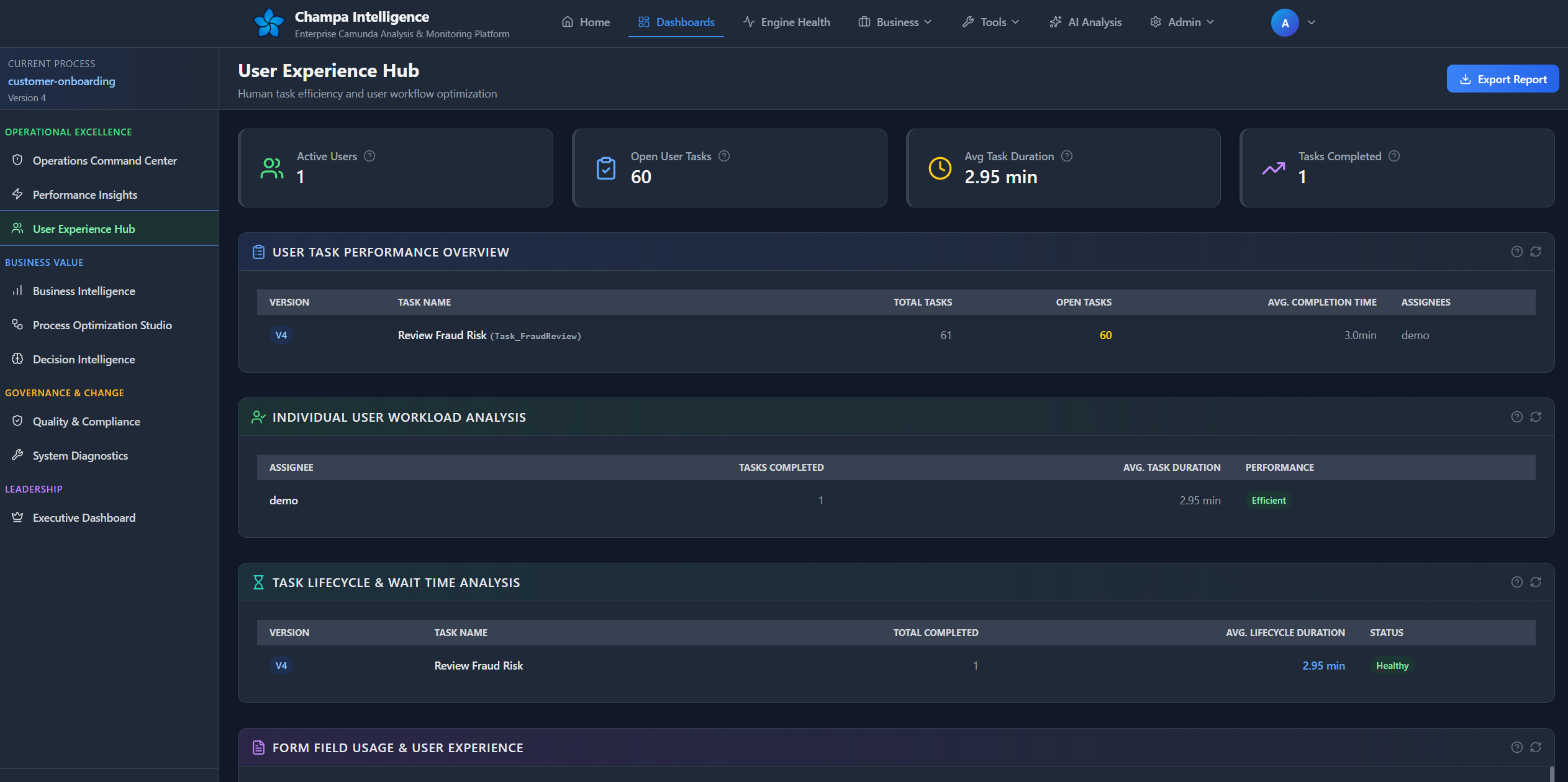 The Process Intelligence Dashboard is your mission control for Camunda process analysis, delivering deep insights into performance, quality, and operational health across your BPMN processes.