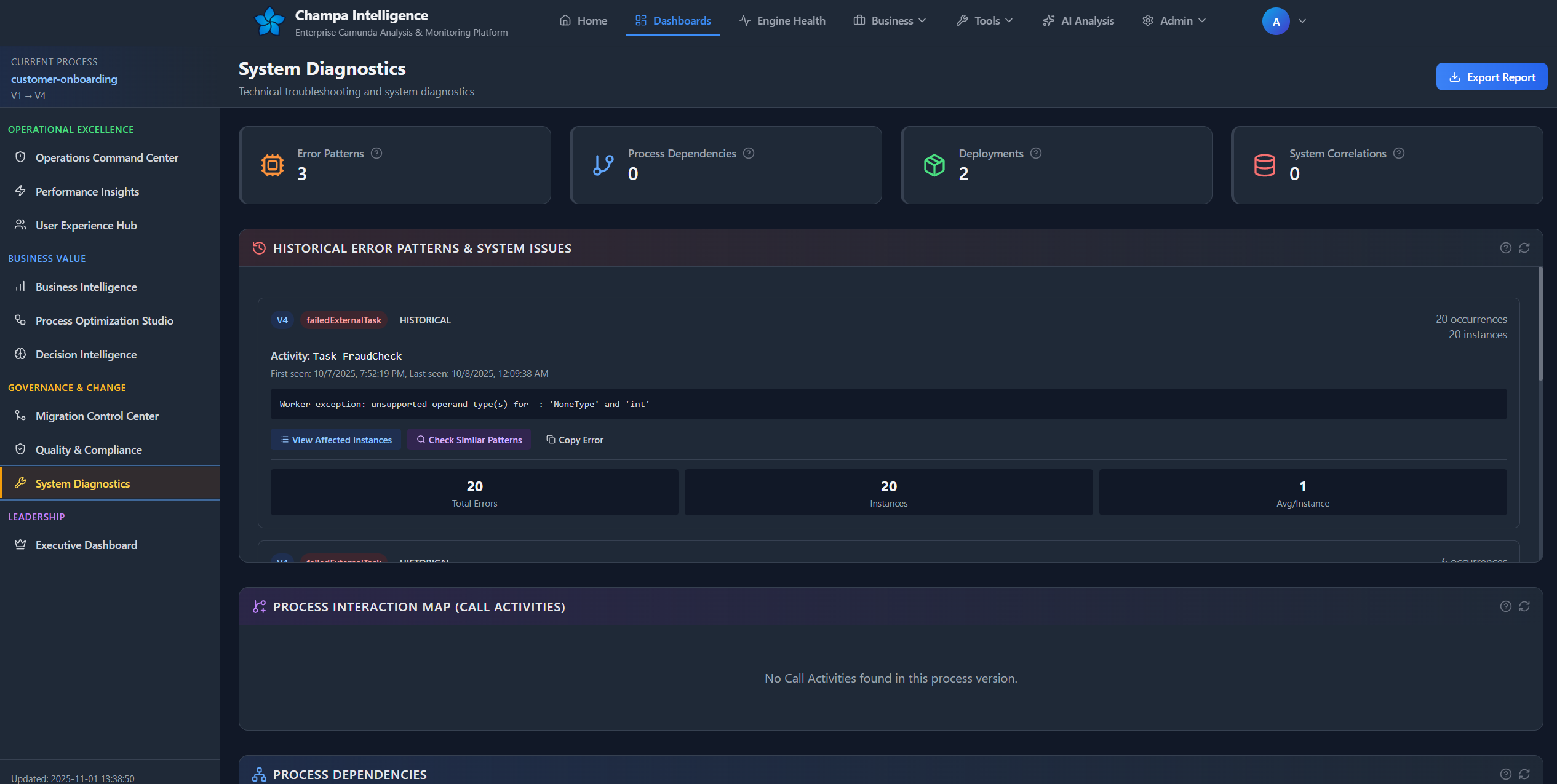 /api/dashboard/section/<name>- Tab data/api/dashboard/metric/<name>- Individual metrics/api/dashboard/experimental/<name>- Advanced analytics/api/instance-history/<id>- Instance audit trail/api/variable-details- Variable sampling/api/export-report- Full analysis export