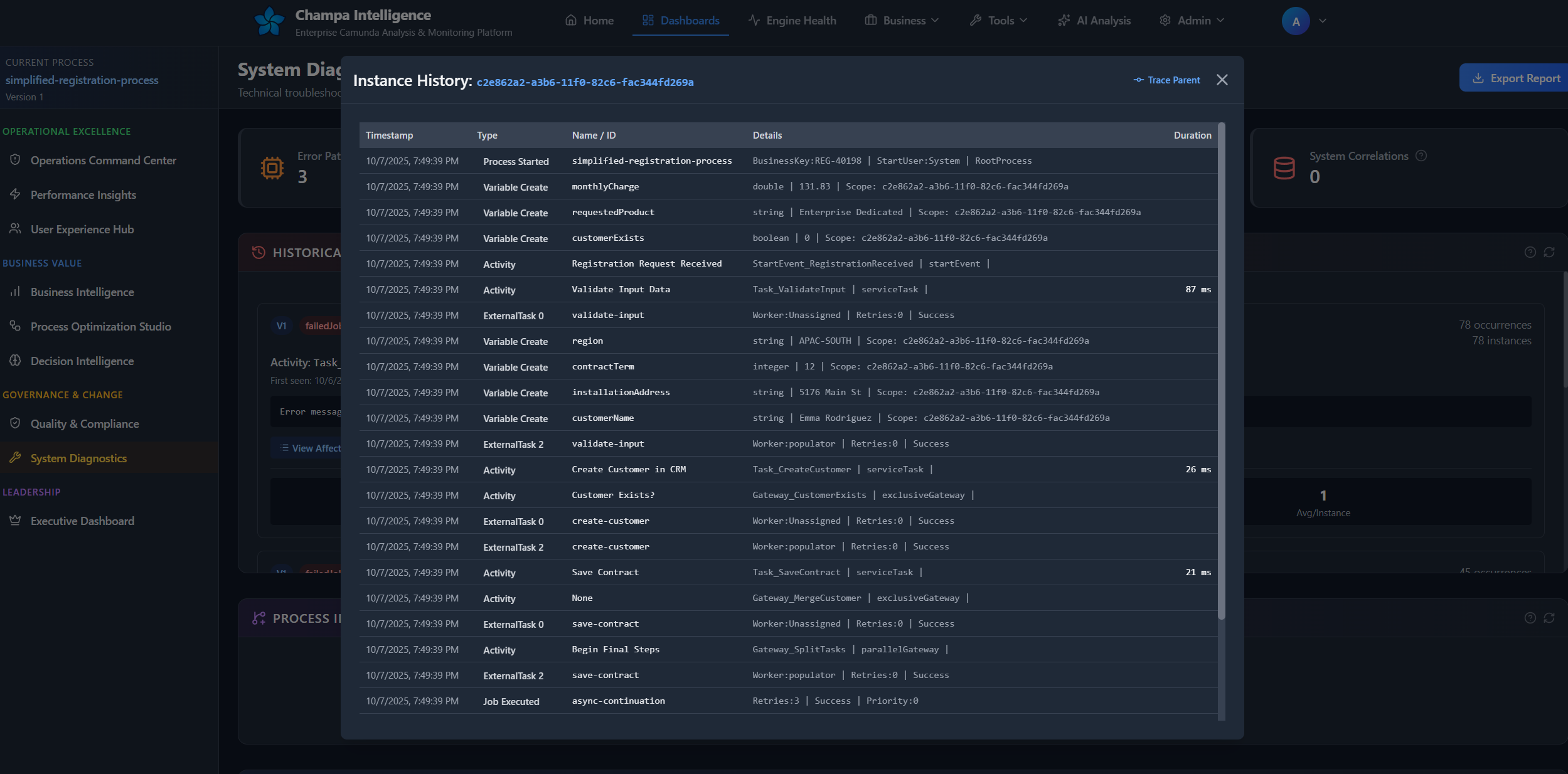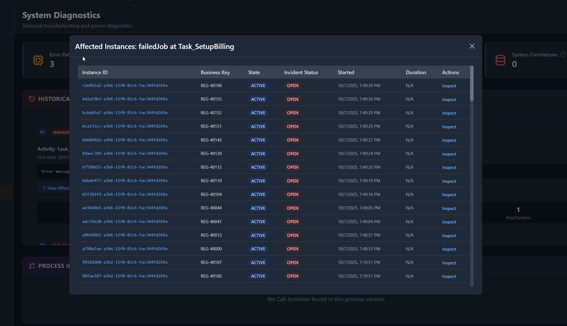 - Inspect individual instances via Process History modal